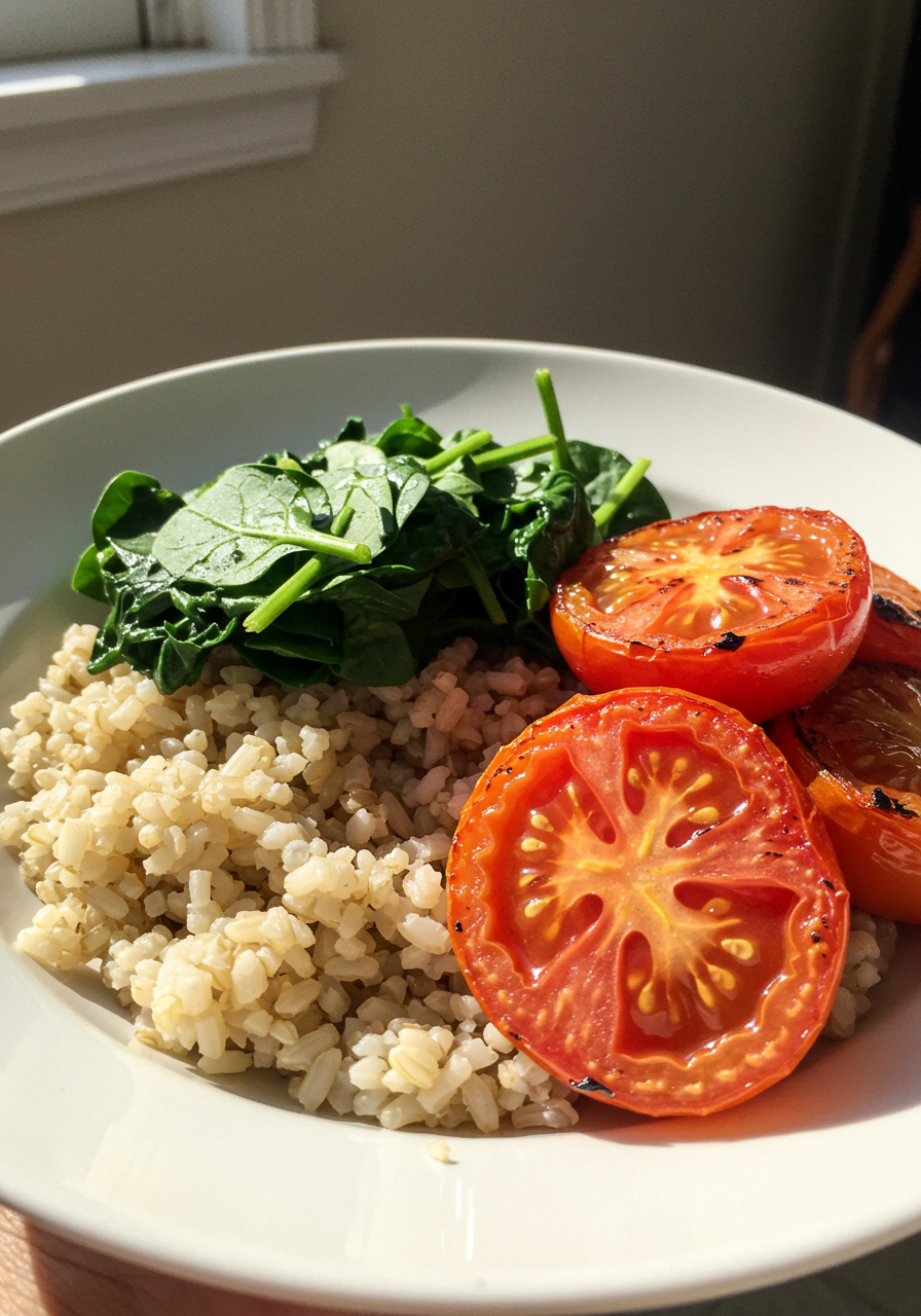 | 점심 | 현미밥 + 시금치나물 + 토마토구이 | 저염식, 항산화 성분 |